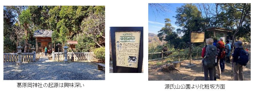 まずは、北鎌倉駅直近の円覚寺で舎利殿と洪鐘(ともに国宝)を見学した。今日の鎌倉は社会科見学で多くの中学生が訪れていて平日でも賑やかだった。縁切寺「東慶寺」にも立ち寄り、浄智寺から葛原岡ハイキングコースに入る。このコースは初めてでワクワクした。階段、続いて木の根の多い乾いた山道を歩き、ちょっとした山登り気分を味わって葛原岡神社についた。木立に囲まれた暗い寺が多い中、葛原岡神社は源氏山公園に連なる開けた丘に建っていて明るく見晴らしが良かった。元寇の変で捕らえられこの地で処刑された日野俊基について学び歴史を感じることが出来た。源氏山公園に立つ源頼朝像のそばの陽だまりで昼食をとる。この像は頼朝の鎌倉入り800年を記念したものだそうだ。