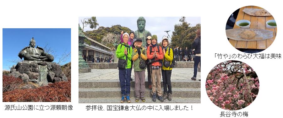 午後は、銭洗弁天に立ち寄り、長谷の大仏へ下った。最後に長谷寺で満開の紅梅、白梅、桃色のしだれ梅に早春を満喫して、鎌倉駅まで歩いた。また別のコースの鎌倉アルプス史跡ハイキングに出かけてみたいと思った。