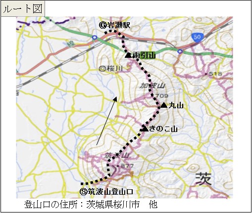 柏⇒4:08りんりんロード休憩所(筑波山登山口)4:54→筑波山神社→(御幸ヶ原コース)6;54筑波男体山→7:29女体山→キャンプ場→10:29きのこ山→11:45足尾山→12:22一本杉峠→12:40丸山→12:49ウィンドパワーつくば風力発電所→13:32加波山→14:14燕山→16:13雨引山→17:06御嶽山→17:44岩瀬駅18:25⇒19:20りんりんロード休憩所⇒21:00柏