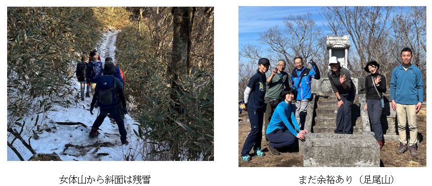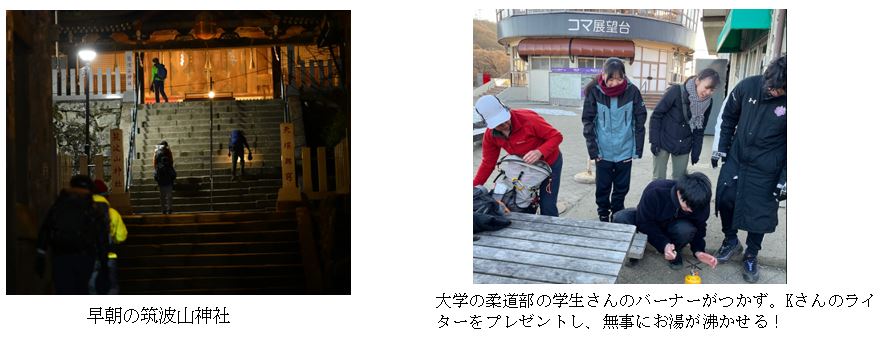 暗く寒い朝から1日が始まりました。ヘッドライトの灯りが希望を導き、7名の士気は高く弾む会話と共に先ずは筑波山、御幸ヶ原を目指します。土曜日のせいもあるのか、ヘッドライトを灯しながら登る方が数組あり驚きました。男体山山頂では春が近づいている事を感じるような春霞で、富士山の山頂のみが望めました。女体山から下る際はしっかり残雪があり、この間だけチェーンスパイク等を着用しました。