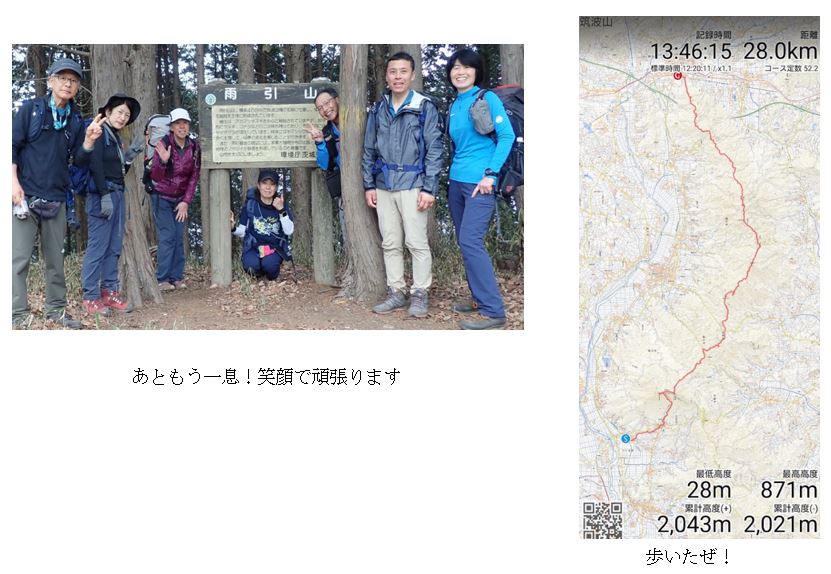 以降はKさんとMさんが「え?」と驚くほど案内もない分岐で、進行する登山道に導いて頂き、順調にコースを進めます。気温は上がり、風もなく気持ちよく歩けるものの、疲労は徐々に蓄積し昇るのも下るのも足への負担は隠せません。それでも雨引山の山頂では遠目に筑波山を眺め、自分達が歩いてきた峰々の姿を望み、自分にも仲間にもエールを送りゴールを目指しました。御嶽山を過ぎた後にヘッドライトを準備したもののほぼ使用なく、ゴールの岩瀬駅には2時間弱も早く到着できました。