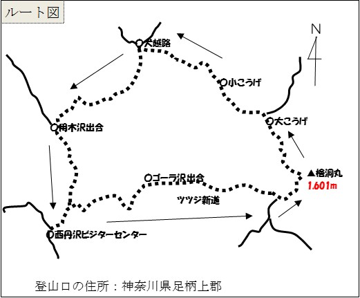 西丹沢ビジターセンターⓈ 6:40→ゴーラ沢出合 7:35→展望園地 8:45→檜洞丸 10:00(休憩)10:35→青が岳山荘 10:40→檜洞丸 10:50→熊笹ノ峰 11:30→大こうげ 11:40→小こうげ 12:55→犬越路 14:00→ツツジ新道 15:55→西丹沢ビジターセンターⒼ 16:00