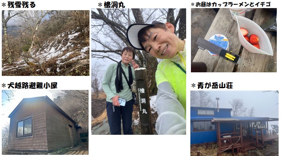 初めはなだらかで歩きやすい。ツツジ新道からは急に傾斜がきつくなりハシゴや鎖もある。息を上げながら何とか檜洞丸に到着した。やはりガスっていたが寒くはない。