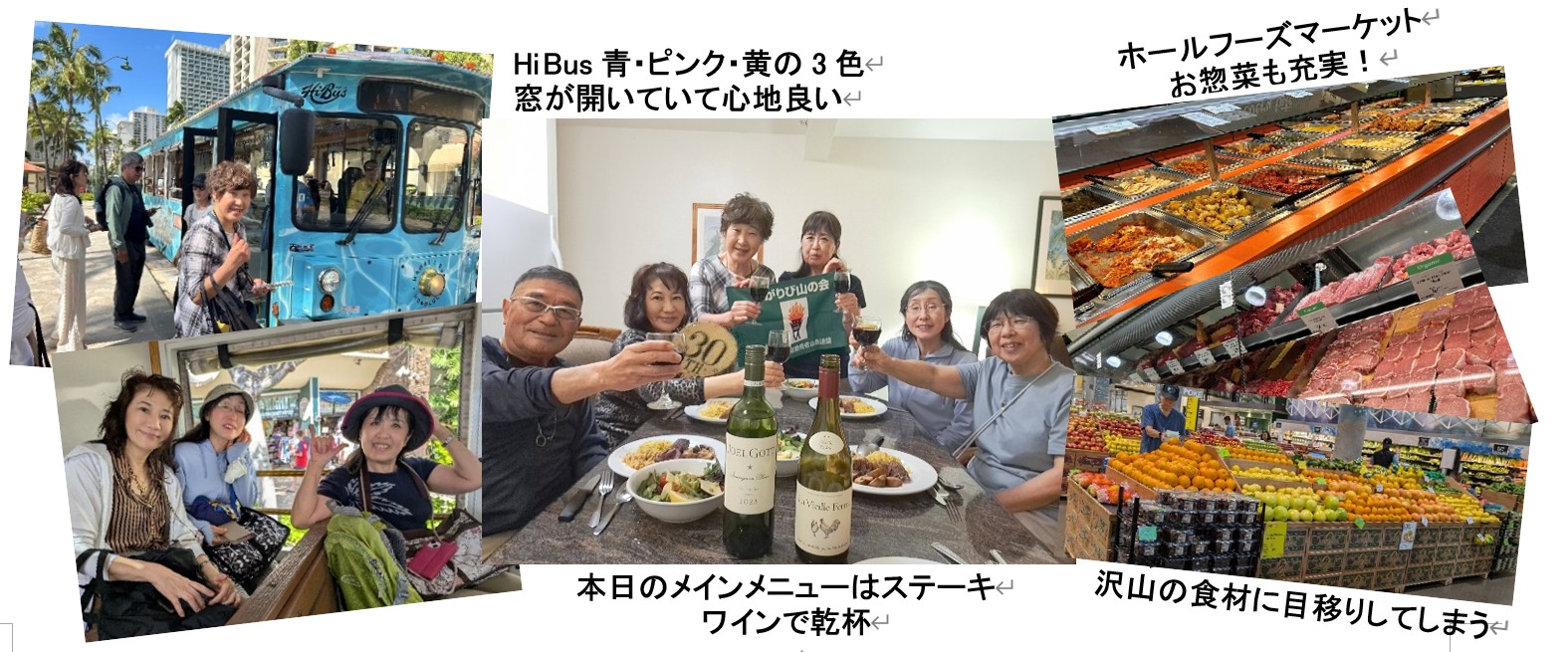 ワイキキビーチで軽食を済ませ、LeaLeaラウンジで最終情報収集後、ホールフーズマーケットへ買い出しに行く。ハワイ4日間はHiBusを活用(事前予約が必要。eチケットを見せて乗車)。ホテルに戻り初日の晩餐会。