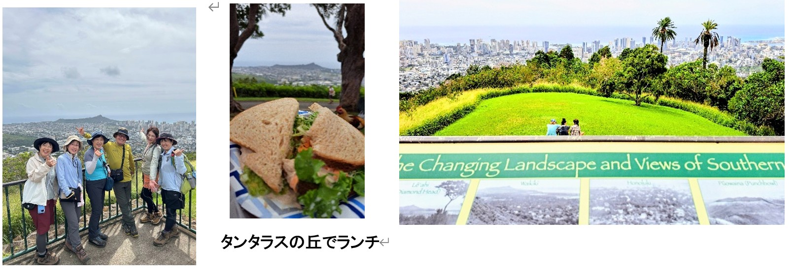 集合場所9:25⇒マノア滝入口10:15→11:00マノアの滝11:20→マノアの滝入口12:10⇒12:45タンタラスの丘(ランチ)13:30⇒14:10解散場所
