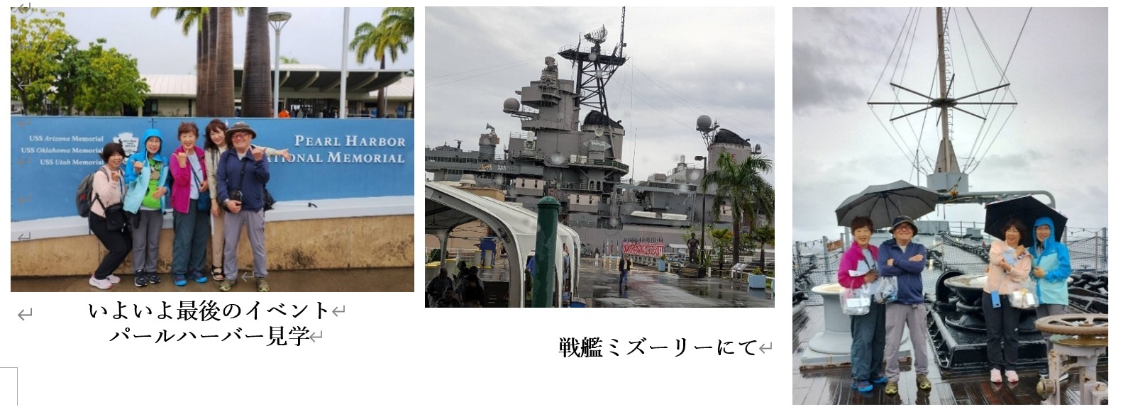 当日は洪水警報のためアリゾナ記念館ツアーは中止となりましたが、戦艦ミズーリー館を見学しました。降伏文書調印が行われた場所や神風特攻機の突入に関する説明を通して、戦争の現実を強く感じました。
