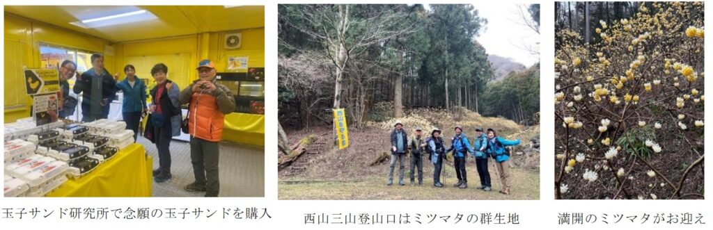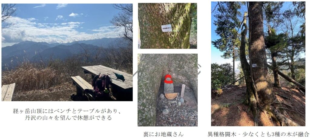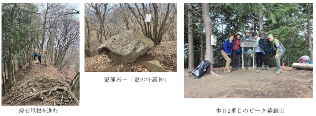 ミツマタの保全、案内図の整備、登山道の維持、各種案内板の設置(蚕種石、裏側に祀られたお地蔵様、異種格闘木――中央の主木はモミと見られるが、残る2種は不明――など)に尽力されている「西山を守る会」の皆様に感謝しつつ、無事に山行を終えた。