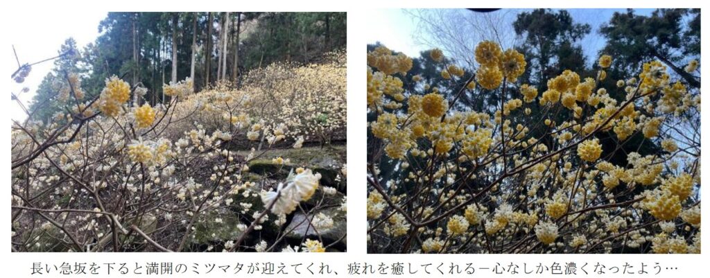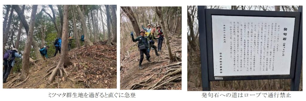 登山口はミツマタ群生地の入口に位置し、黄色の愛らしい花を宙に浮かべるように咲かせたミツマタが見事に広がり、まさに“映える”光景である。「ミツマタ桃源郷」とはよく言ったものだが、ミツマタなのに桃源郷とはこれいかに、などと話しながら急登をひたすら登る。やがて発句石の案内板に辿り着く(発句石への道はロープが張られ、立入禁止となっている)。