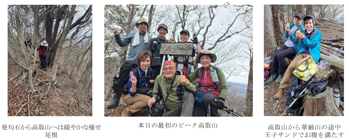 柏駅前⇒947玉子サンド研究所ヤマモトや⇒大平登山口駐車場1031→1145発句石→1149高取山1201→(昼食休憩)→1242華厳山1252→1345経ヶ岳1416→1503華厳山1516→1531高取山1537→1541発句石→1633大平登山口⇒1930柏駅