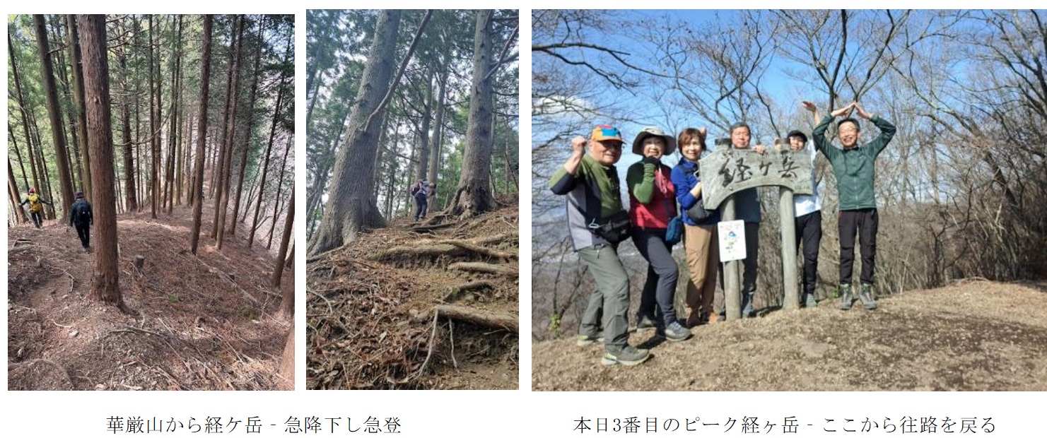 ここから高取山までは比較的緩やかな登りが続くが、思いのほか痩せ尾根である。眺望は素晴らしく、関東平野を一望できる。いったん緩やかに下り、再び登り返して華厳山へ。そこからは急下降(体感的には数百メートル、実際には百数十メートルほどか)し、さらに急登を登り返して経ヶ岳山頂に至る。ベンチとテーブルがあり、一休みして、往路を引き返した。