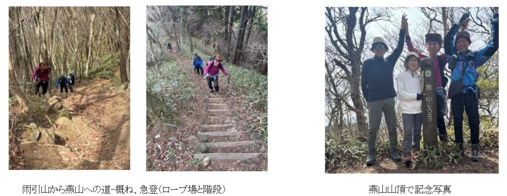 コースは、思いのほか、急登が多く(特に雨引山から燕山にかけては長い階段に加えロープ場もある)、歩行距離もあり、体力を要する内容だった。トレーニングにも適した、充実したコースであった。