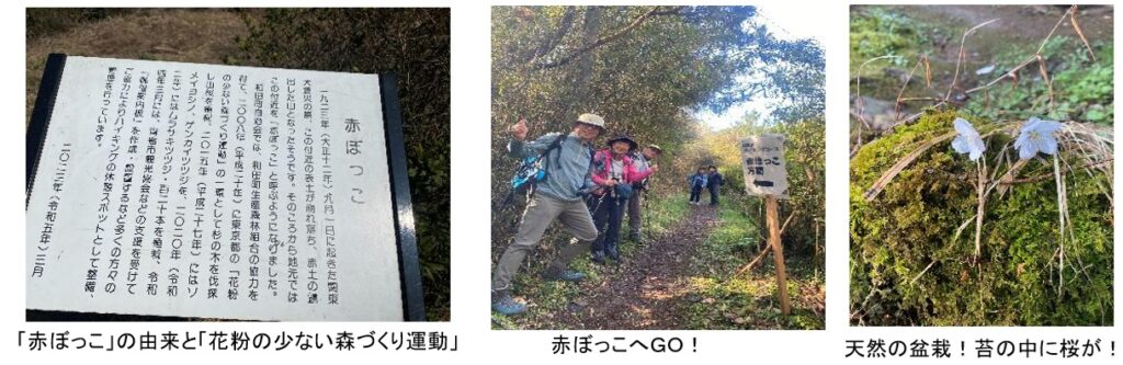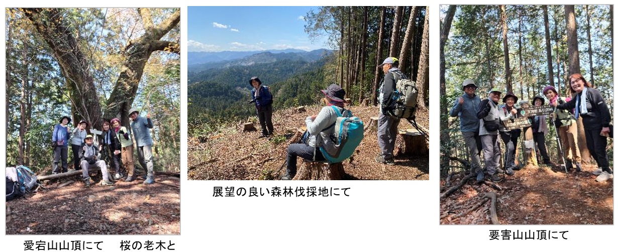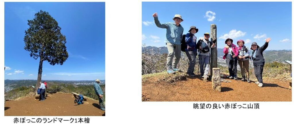 2座目の要害山が今日の最高峰だが展望なし。要害山の手前に森林伐採地が開けており展望が素晴らしかった。切り株が腰を掛けるのにピッタリで各々がお気に入りを見つけて春の風景を満喫した。切り株の隣に小さな苗が植樹されていてほっとする。要害山から赤ぼっこまでは、アップダウンがあり軽いトレーニングにピッタリだ。