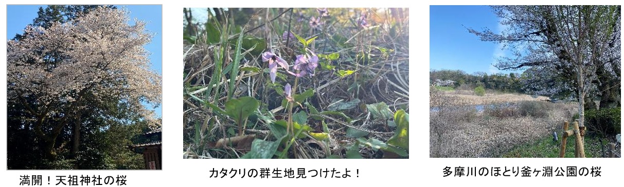最後の天祖神社を出た所で思いがけずカタクリの群生地を見つけて感激!青梅駅に向かう途中で多摩川沿いの釜の淵公園に立ち寄り自然な感じの桜を鑑賞し岐路に就いた。