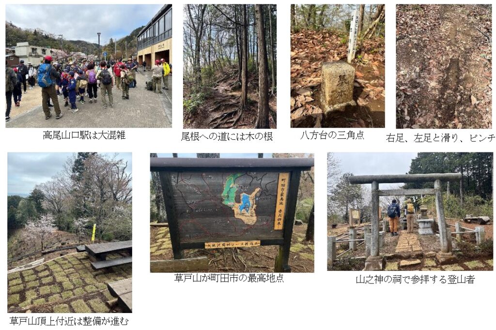 八方台から本道に戻り、草戸峠を経て、本日最初のピークである草戸山へ。山頂は広く、松見平展望台や大山祇命を祀る「山の神」の祠があり、眺望も良い。土壌流出を防ぐための芝の植栽など整備が行われている。町田市の最高点であることを示す看板があったが、三角点はない。
