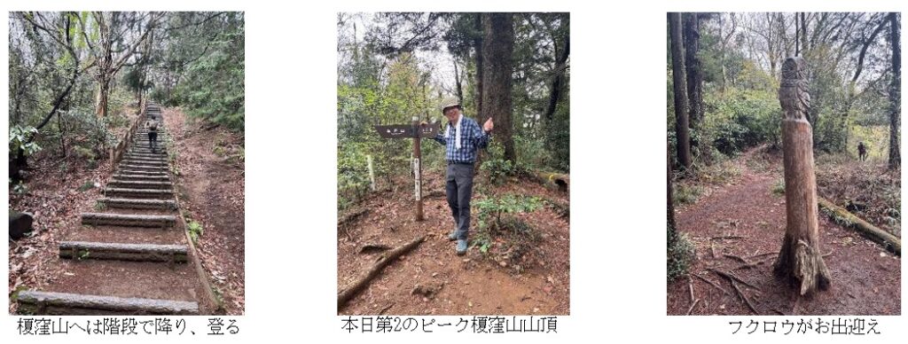 階段状の登山道を下り、登り返して榎窪山へ。ここも三角点はなく、展望もない。分岐を示す道標に山頂名が記されているのみで、やや寂しい印象を受ける。木彫りのフクロウを過ぎ、三つ目のピークである泰光寺山へ。ここもまた渋く、樹木に固定された小さな板に山名が書かれているだけである。