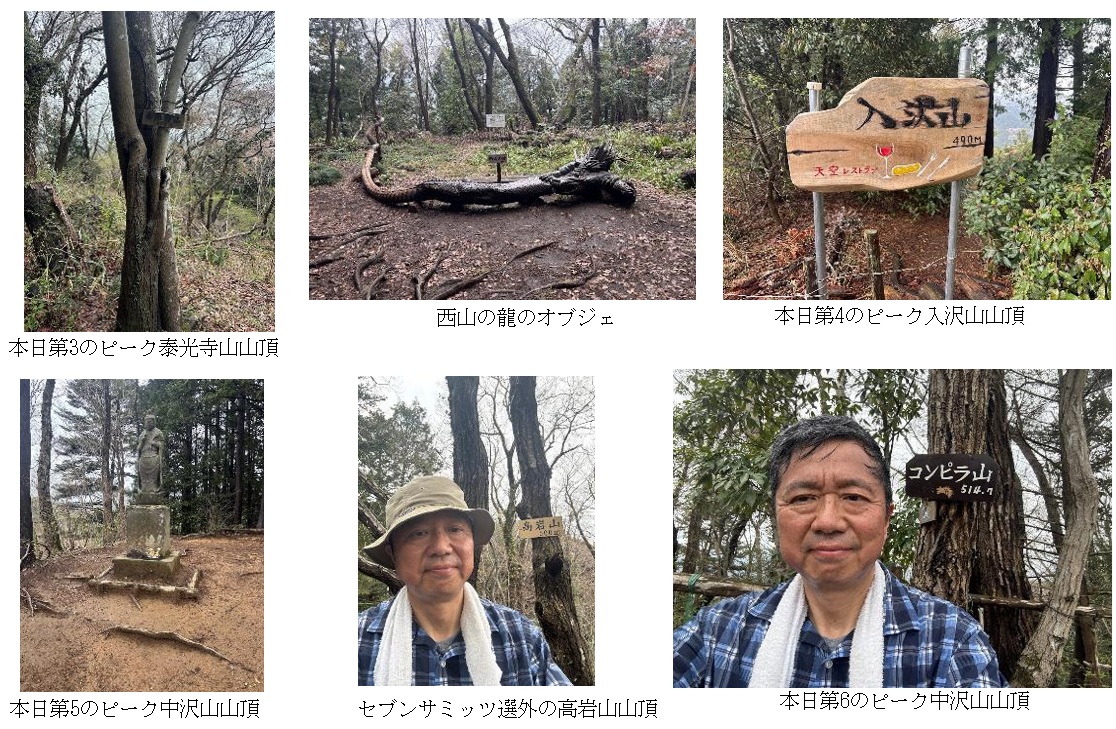 木彫りの西山の龍、西山峠を経て入沢山へ向かう。分岐点に標識がなく、他の登山者がハイカーの集団に道を譲られ巻き道を進んだものの、途中で引き返してきた。一方、ハイカーの集団はそのまま巻き道を楽しそうに進んでいった。入沢山への登山道は急登で滑りやすいが、登り切ると「入沢山天空のレストラン」というカラフルでやや場違いにも感じられる看板が現れる。ベンチとテーブルがあり、街並みの展望も開けていて、休憩には最適である。なお、この区間、段差が設けられるなど整備が進められていると登山者から聞いた。