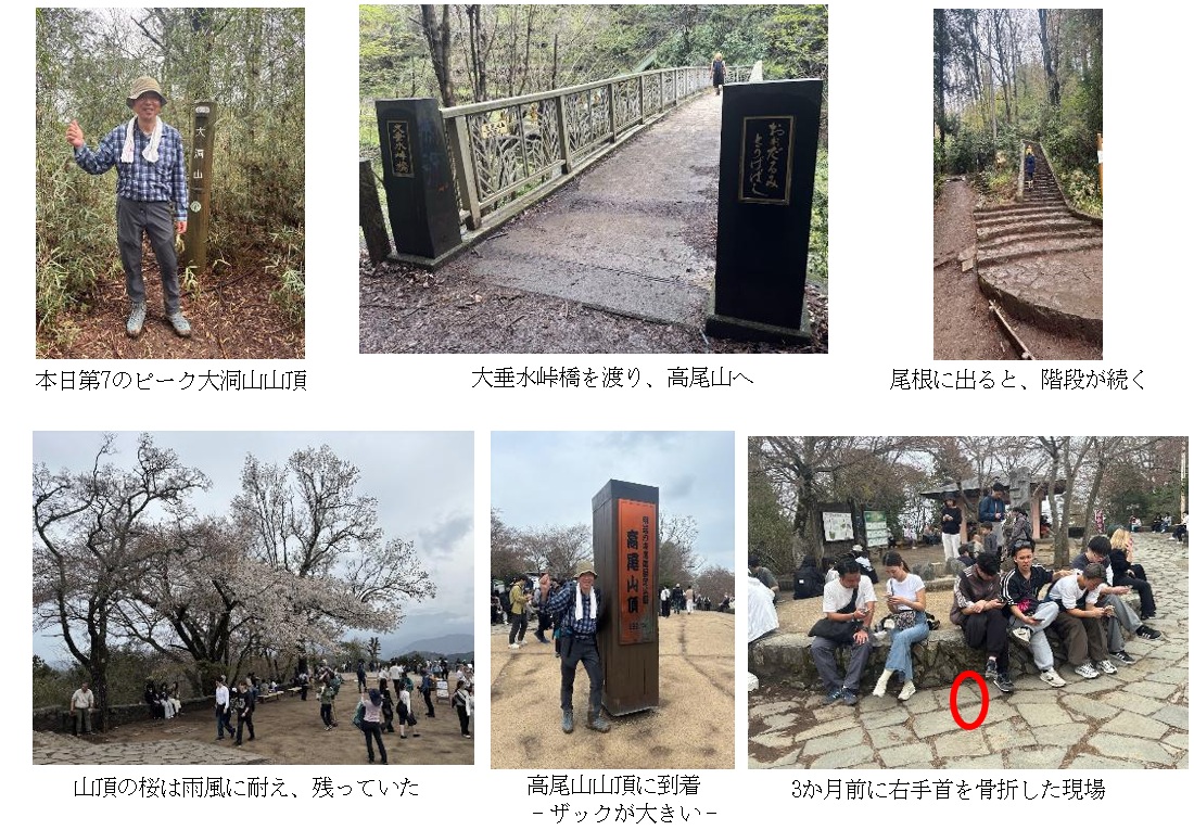 下山する前に、三か月前に右手首を骨折した現場を検証した。高尾山山頂の三角点は二等三角点で、花崗岩の盤石と四つの保護石が配され、さらに一段高い石組みによって守られている。私はこの一段高い部分から何の警戒もなく後ろ向きで石畳に落ちたのだ。右手首の骨折と8針の縫合で済んだのは、不幸中の幸いだったのかもしれない。